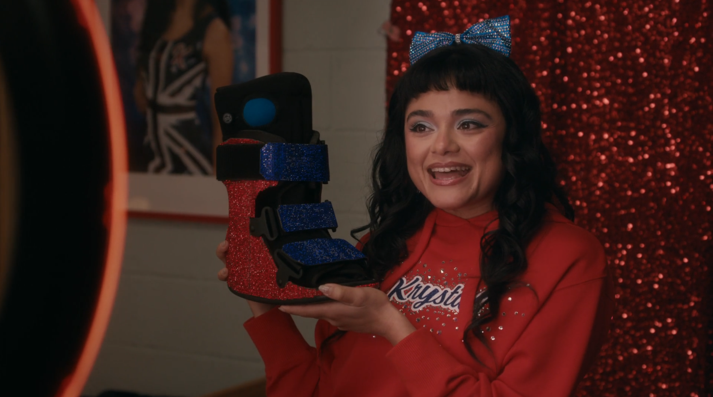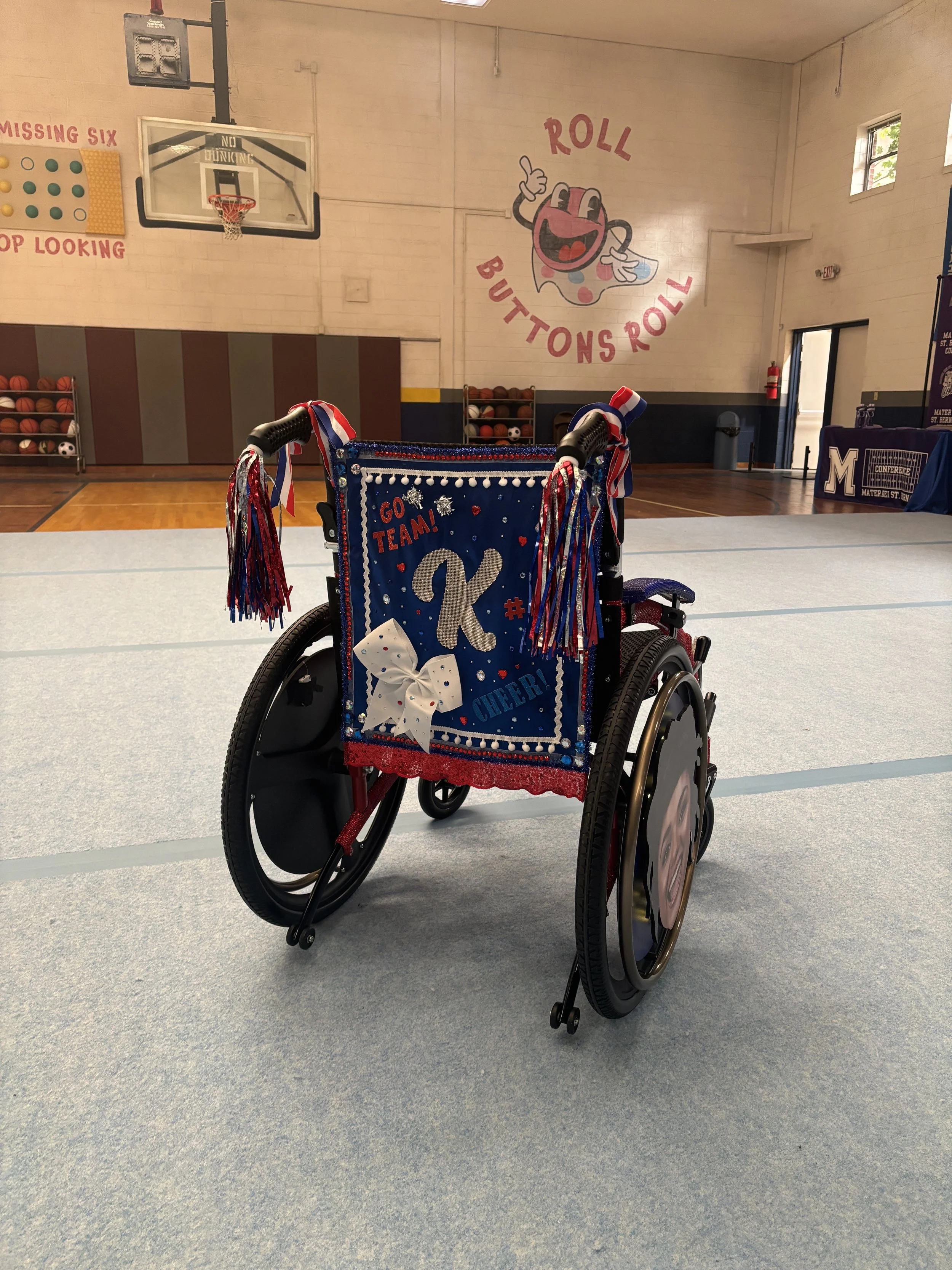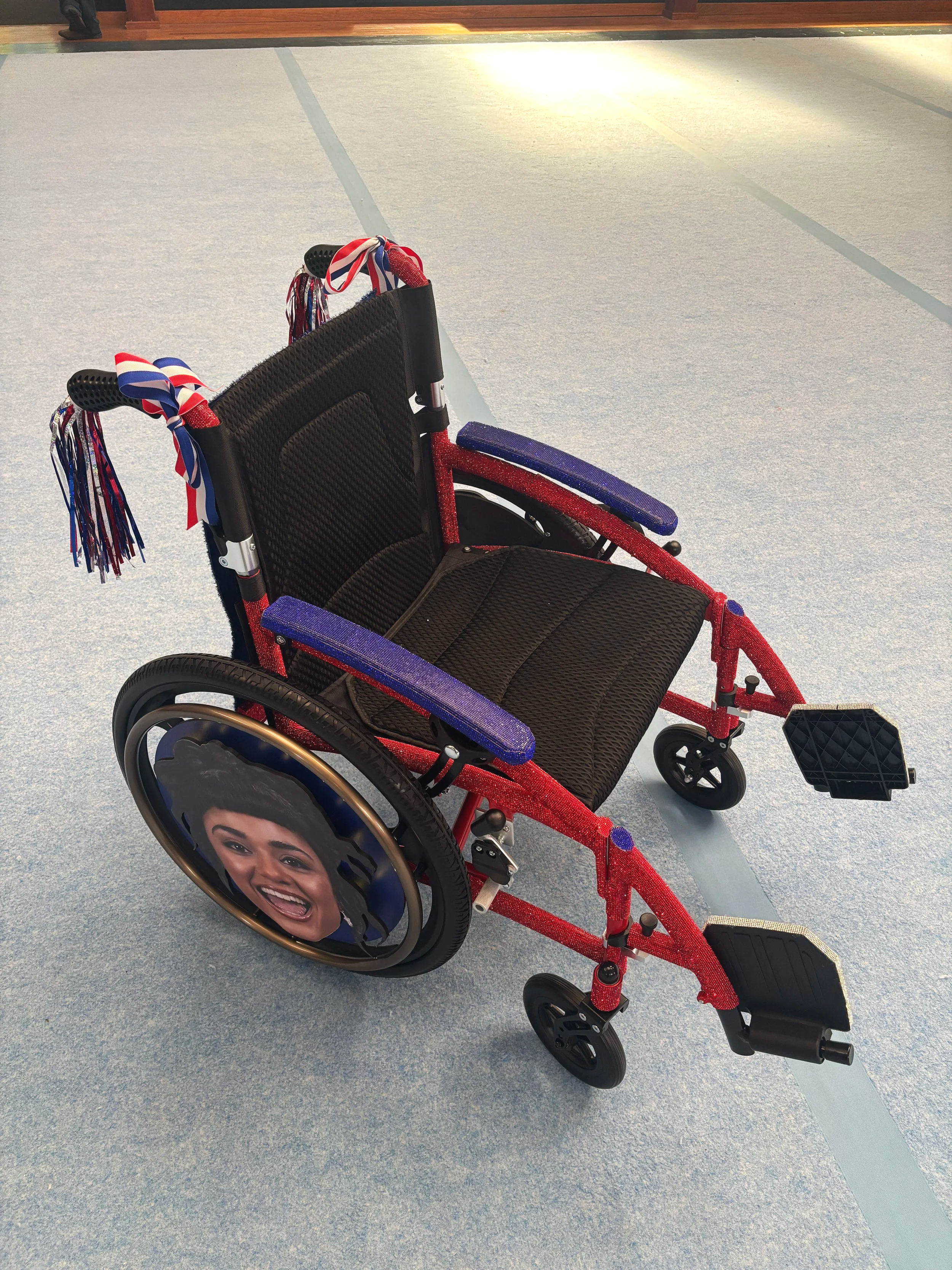 Custom wheelchair bedazzled in red and blue rhinestones, a personalized banner, tassel handles, and a printed graphic adhered to the wheels